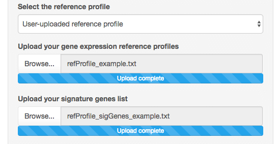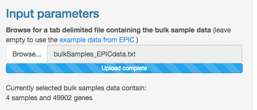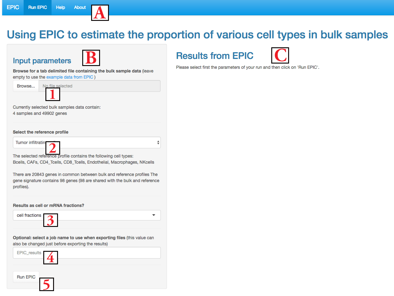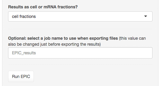 In order to launch EPIC , you need to (1) upload some bulk gene expression samples, (2) select which reference profiles to use, (3) decide whether results should be given as cell fractions or mRNA fractions, (4) optionally give some name to your job for the file downloads and (5) then click on Run EPIC to launch the computations (it takes some seconds or minutes depending on the number of samples and genes).