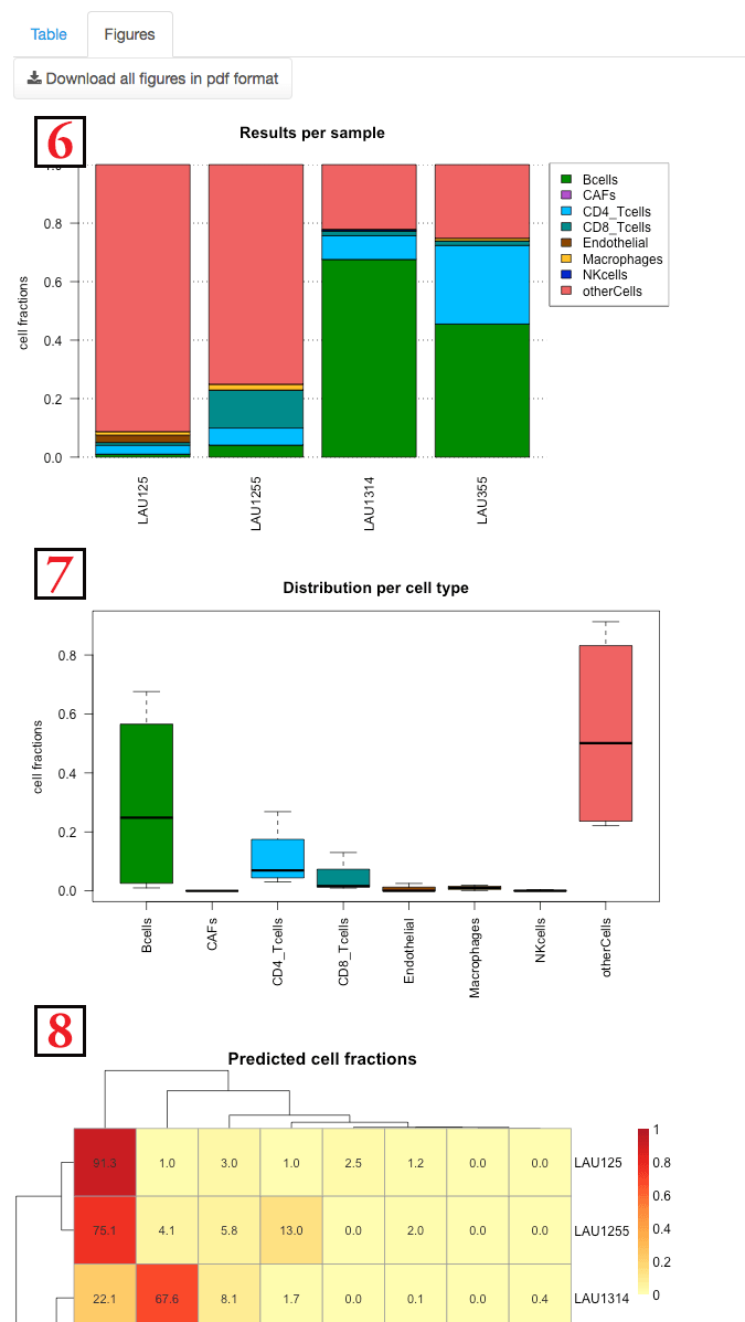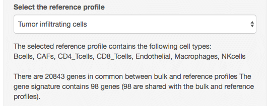 Under the selected profile, some text indicates which cell types are present in this profile (note that EPIC will also predict the proportion from an additional cell type for which no reference profile was provided). Some other text gives information about the number of genes that could be matched between the reference profiles and the bulk samples.
