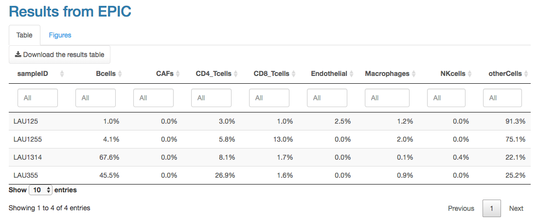 EPIC is also available as an R -package ( https://github.com/GfellerLab/EPIC ), containing some advanced options. Release version 1.1 of the package is used in this web-application.